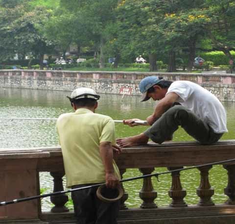 Khu vực hồ trong công viên trở thành một ao nhà lý tưởng cho việc đánh bắt cá nhằm cải thiện bữa ăn của gia đình họ? Trước sự chứng kiến không mấy hài lòng của khách tham quan trong ngày thứ bẩy 26/8 tại vườn thú, anh Nguyễn Trọng Nam (trú ở quận Ba Đình, Hà Nội) đi cùng với con trong vườn thú rất bất bình: “tôi chẳng hiểu nổi đây là khu vườn thú dành cho khách tham quan hay là khu đánh bắt cá của họ, họ ngang nhiên câu và đánh bắt cá rất tự do”.