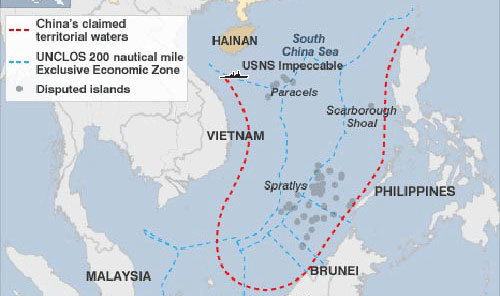 Trung Quốc tự mình đưa ra tuyên bố chủ quyền với toàn bộ Biển Đông, bằng cách dẫn dắt những bản đồ cổ xưa với phía nam kéo dài tới tận bờ biển phía bắc của Malaysia. Việt Nam, Philippines, Brunei và Malaysia đều có tuyên bố chủ quyền ở Biển Đông.