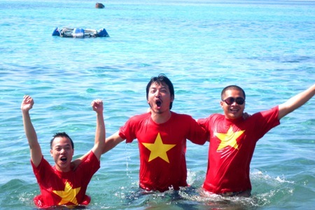 Những chiếc áo cờ đỏ sao vàng nổi bật hẳn lên trong làn nước xanh như ngọc. Ảnh: Trần Hùng |