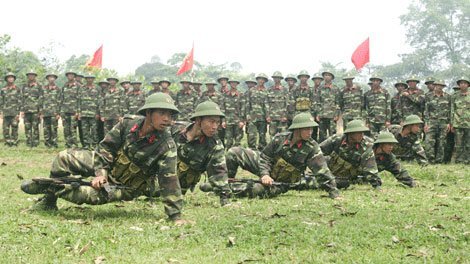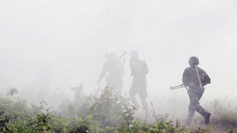 | Lính bộ binh diễn tập xông pha trong khói, lửa đánh chiếm cứ điểm địch ở địa hình trung du |