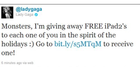 Thông tin giả mạo được đăng tải trên tài khoản Facebook vào ngày 19-12 đã đánh lừa được đông đảo người hâm mộ mong muốn có được chiếc máy tính bảng phiên bản Lady Gaga. Khi click vào đường dẫn thu gọn dạng "bit.ly", họ sẽ được chuyển đến trang thu thập thông tin cá nhân theo dạng đăng ký để nhận quà. Dòng thông tin bị gỡ bỏ một tiếng sau đó nhưng chắc chắn hacker đã thu thập được rất nhiều thông tin nhạy cảm mà các nạn nhân vô tư cung cấp.