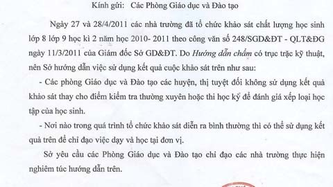 Công văn 519 ngày 29/4 phát tới các phòng GD-ĐT, yêu cầu “tuyệt đối không được lấy kết quả điểm thi khảo sát học kỳ II lớp 8, lớp 9 (do Sở ra đề chung) làm điểm tổng kết học kỳ II”.