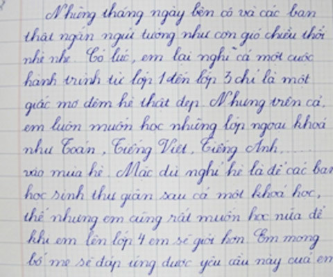 Có trí tưởng tượng khá phong phú, biết “lo xa”, bé Nguyễn Vân Anh ví von tả: “Có lúc, em lại nghĩ cả một hành trình từ lớp 1 - lớp 3 chỉ là một giấc mơ đêm hè thật đẹp. Nhưng trên cả, em luôn muốn học những lớp ngoại khoá như Toán, tiếng Việt, tiếng Anh... vào mùa hè. Mặc dù nghỉ hè là để các bạn học sinh thư giãn sau cả một khóa học, thế nhưng em cũng rất muốn học nữa để khi em lên lớp 4 em sẽ giỏi hơn. Em mong bố mẹ sẽ đáp ứng được yêu cầu này của em”.