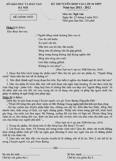 Đề thi môn Ngữ văn vào lớp 10 ở Hà Nội năm học 2011- 2012 |