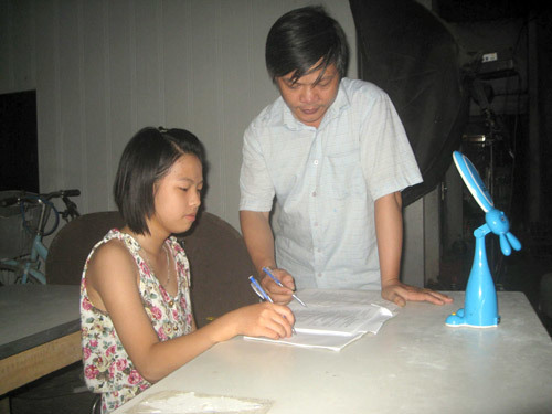 Nhìn căn phòng học của hai bố con cũng chính là phòng làm việc của vợ anh rộng chưa đầy chục mét vuông, bày biện nào bảng đen, bàn, ghế, bộ đèn chụp ảnh, chỉ chừa lại một lối đi nhỏ vào bếp, thầy Khoa bảo: "Nhiều khi khách đến chụp hình, vợ chụp thì cứ chụp, còn con vẫn cặm cụi làm bài. Cũng bất tiện lắm nhưng biết làm sao. Cha mẹ khó khăn thì các con cũng phải hiểu và chấp thuận thôi".