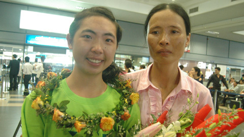 Đặng Thu Trang chụp chung với mẹ tại sân bay Nội Bài chiều 19/7. |