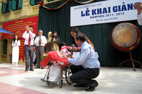 Phó Thủ tướng Nguyễn Thiện Nhân với cô học trò đặc biệt của Trường THPT Việt Đức - cô bé xương thủy tinh. Ảnh: Nguyễn Hường