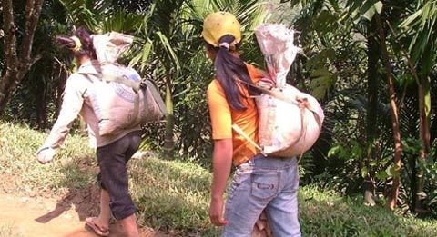 Học trò vùng cao Quảng Nam gùi gạo xuống nơi học. Ảnh: Vũ Trung