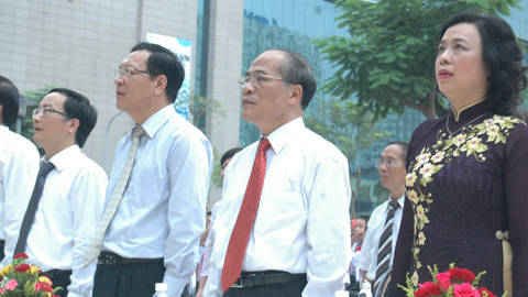 Chủ tịch quốc hội Nguyễn Sinh Hùng cùng các lãnh đạo TƯ và thành phố Hà Nội, lãnh đạo nhà trường nghiêm trang trong lễ chào cờ, khai giảng năm học 2011-2012.