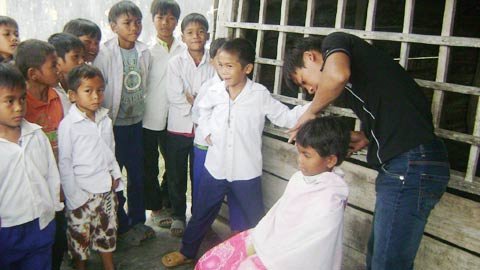 | Cắt tóc cho các em học sinh trong giờ nghỉ. |