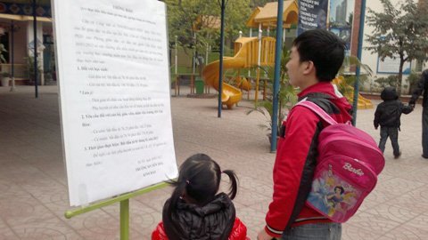 | Phụ huynh đọc thông báo về việc thay đổi lịch học và đón trả con. Ảnh chụp tại Trường Mầm non Yên Hòa (Cầu Giấy). |