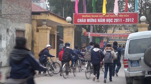 | Học sinh hối hả đến trường. Ảnh chụp tại Trường THPT Yên Hòa (Cầu Giấy, Hà Nội). |