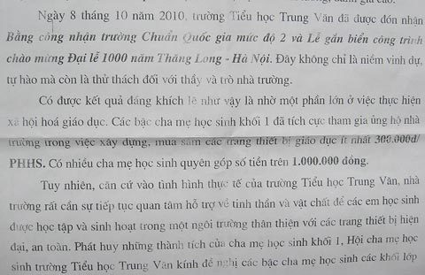 | Thư ngỏ kêu gọi phụ huynh đóng góp số tiền 300.000 đồng của Hội cha mẹ HS nhà trường. |