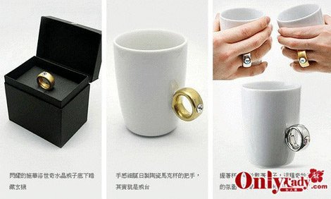 Với thiết kế xinh xắn, nhỏ gọn, 2 quai cốc được cách điệu hình cặp nhẫn đính đá kim cương cùng 2 chiếc thìa khắc chữ I love you, khi mở hộp quà, người được tặng sẽ tưởng đây là một chiếc nhẫn nhưng khi đưa tay vào kéo lên, hẳn bạn sẽ ngỡ ngàng khi món quà “hiện nguyên hình” là một chiếc cốc, một số chàng trai đã mua tặng bộ cốc này thay cho lời hẹn ước đính hôn vào giờ khắc thiêng liêng của ngày lễ Valentine.
