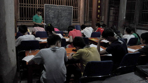 Thí sinh luyện thi tốt nghiệp ở đình làng. Ảnh: Văn Chung |