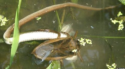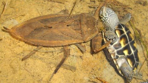 | Bọ nước khổng lồ ăn thịt rùa con. Ảnh: BBC |