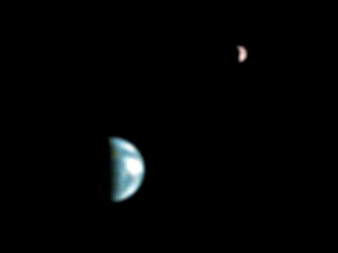 Đây là bức hình đầu tiên về trái đất cùng mặt trăng lấy góc nhìn từ trên Sao hỏa được chụp vào ngày 8/5/2003 bởi chiếc Camera quan sát bên ngoài một vệ tinh khảo sát địa cầu Sao hỏa của NASA. Được chụp từ khoảng cách 139 triệu km so với Trái đất, hình ảnh lần đầu tiên phô bày một lát cắt về bán cầu tây của Trái đất cũng như thể hiện góc nhìn khoa học khách quan về địa cầu chúng ta đang sống.