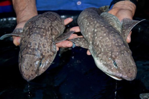Một nghiên cứu viên Viện khoa học California cầm trên tay hai mẫu cá mập