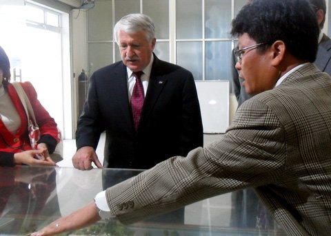 | Ông Michael F. O’Brien đang nghe giới thiệu về sơ đồ Trung tâm vũ trụ của Việt Nam sau lễ ký kết. Ảnh: L.V. |