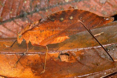 5. Một con châu chấu katydid có hình dáng và màu sắc giống hệt một chiếc lá khô trong khu bảo tồn San Cipriano ở Colombia