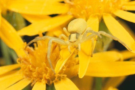 6. Loài nhện độc màu trắng nằm trên bông hoa màu vàng để chờ con mồi sập bẫy.