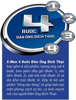 X-Men 4 Bước Đàn Ông Đích Thực bao gồm 4 sản phẩm, tương ứng với 4 bước chăm sóc cá nhân cho nam giới, bao gồm: dầu gội (Bước 1), sữa tắm (Bước 2), sữa rửa mặt (Bước 3) và lăn khử mùi (Bước 4). Đây là bộ sản phẩm “tông-xẹc-tông”, sẽ giúp bạn tạo một phong cách tự tin, cá tính mạnh mẽ của người Đàn Ông Đích Thực. |