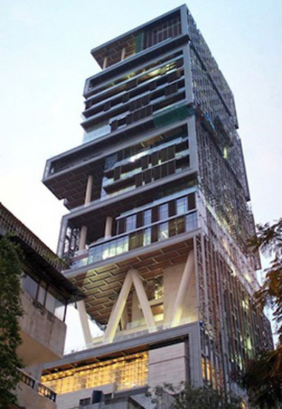 Ngôi nhà cao 27 tầng của tỷ phú người Ấn Độ Mukesk Ambani vừa hoàn thành hồi cuối năm 2010 với tổng chi phí lên tới 1 tỷ USD. Căn nhà có 9 thang máy, trong đó hai chiếc được thiết kế để đi đến gara, 3 thang máy dành cho khách, 2 thang máy cho gia đình Ambani và 2 thang còn lại cho những người phục vụ.