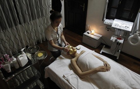 | Một khách hàng nằm nghỉ cùng với lá vàng trên mặt tại thẩm mỹ viện Việt Mỹ hôm 13/2 (Ảnh: Reuters) |