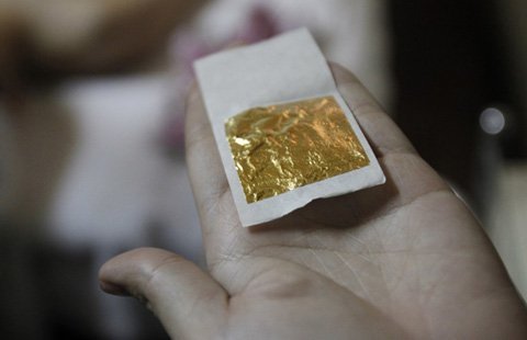 Một lá vàng trước khi được sử dụng để đắp lên mặt cho khách hàng tại thẩm mỹ viện Việt Mỹ hôm 13/2 (Ảnh: Reuters) |