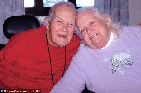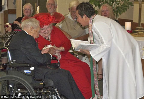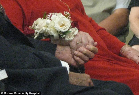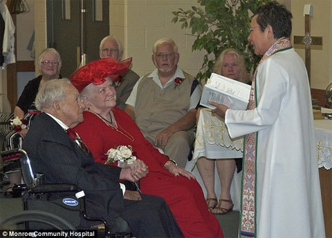 Cặp vợ chồng mới cưới, nhưng ở tuổi gần đất xa trời này vẫn cười rạng rỡ như những cặp vợ chồng còn trẻ, khi trao lời thề ước trước bạn bè và gia đình tại bệnh viện Monroe Community hồi đầu tháng này. Cụ bà Virginia trông chói lọi với chiếc mũ và váy đồng màu đỏ, còn ông Gilbert gài hoa đồng màu đỏ trên ngực áo.