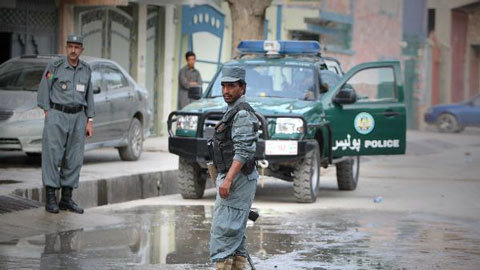 Cảnh sát đứng gác phía trước ngôi nhà của Jan Mohammad Khan, cố vấn cao cấp của Tổng thống Afghanistan. Sớm ngày 17/7, các tay súng chưa rõ lai lịch đã tấn công nhà của Jan Mohammad Khan và bắn chết ông này. (Ảnh chụp ngày 18/7: THX)