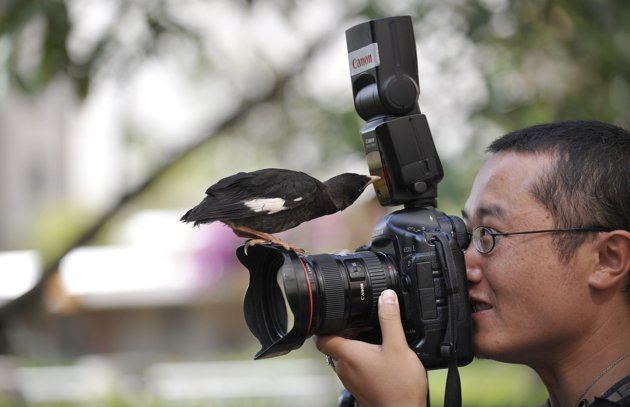 Một chú chim tò mò đậu trên ống kính máy ảnh khi người chủ của chú đang trả lời phỏng vấn truyền thông địa phương tại Côn Minh, Vân Nam, Trung Quốc. Chú chim này bay tới và “xem xét” bất kỳ chiếc máy ảnh nào mà chú thấy. Ảnh REUTERS/Wong Campion