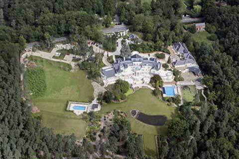 Dinh thự 103 phòng này có cả một sân chơi bowling, một sân chơi bóng quần, một rạp chiếu phim 50 chỗ và 5 bể bơi. Dinh thự rộng 3.716 m2, sàn nhà là tranh ghép mảnh mạ vàng 24k.