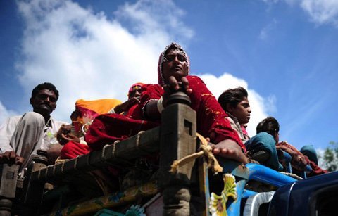 Người dân Pakistan di chuyển tới nơi an toàn, sau khi nước lũ tràn vào quận Badin, tỉnh Sindh hôm 13/9. (Ảnh: THX)