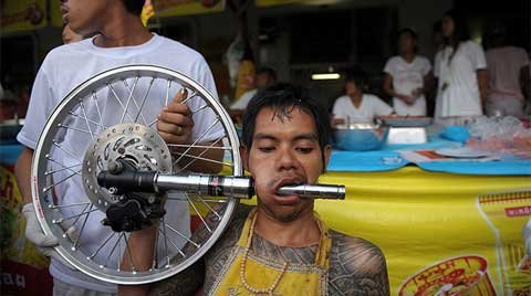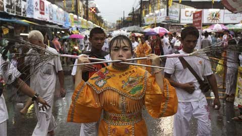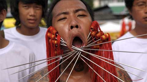 Trong lễ hội ăn chay ở Phuket, miền nam Thái Lan, những người mộ đạo đã xiên mình bằng gươm, chọc thủng má bằng các vật nhọn và làm nhiều việc gây đau đớn khác để gột sạch tội lỗi của bản thân và cộng đồng.