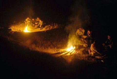 Những người may mắn sống sót chống chọi với cái rét bằng cách sưởi lửa