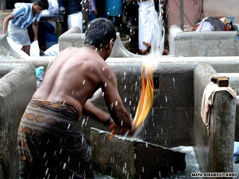 Một thợ giặt giặt quần áo theo cách quật vào đá, một trong những công cụ giặt giũ cơ bản..