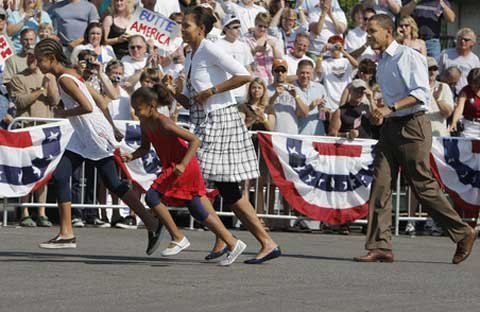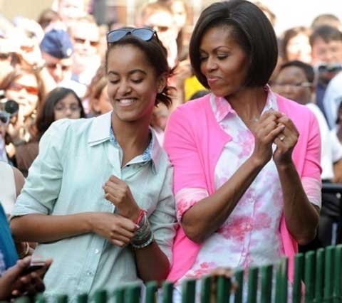Malia, 13 tuổi và Sasha, 10 tuổi ăn mặc rất hợp thời trang trong bộ đồ ngày lễ. Sasha diện một chiếc áo in hình con vật. Trong khi cô em đi giày có gót thì cô chị Malia cao nhỏng lại chọn một đôi giày đế bằng màu đen.