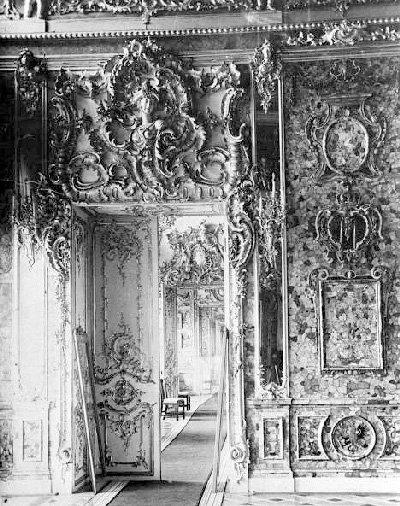 Phòng hổ phách trước khi bị quân Đức cướp đi trong chiến tranh thế giới thứ 2. Sau khi rút khỏi cung điện Mùa thu, quân Đức đã cho đánh sập cả cung điện. Chỉ duy nhất có một căn phòng không bị sập vì bom gài không phát nổ. |