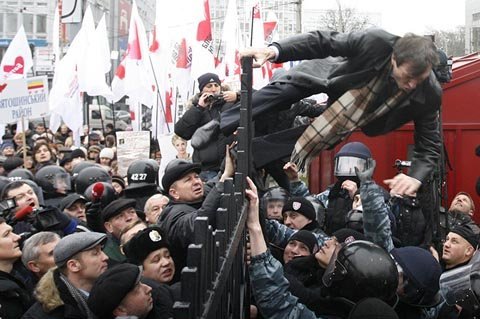 8. Người biểu tình trèo qua hàng rào tại phiên xét xử cựu thủ tướng Ucraina Yulia Tymoshenk tại Kiev. (Ảnh: Guardian)