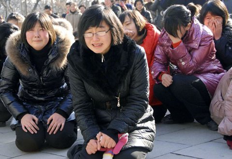 Những nữ sinh quỳ gối khóc khi "vị lãnh tụ kính yêu" của mình đột ngột ra đi. (Ảnh: AP)