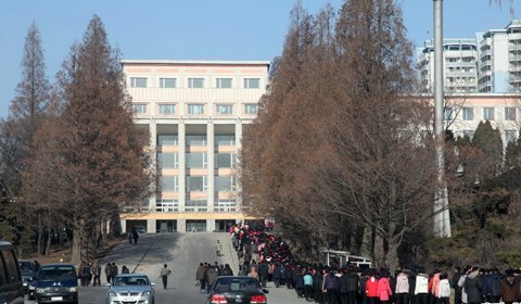Người dân Bình Nhưỡng lặng lẽ xếp hàng tới trước tượng đài Kim Nhật Thành để viếng ông Kim Jong Il. (Ảnh: News.cn)