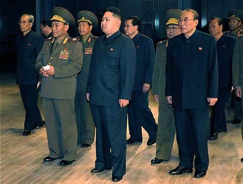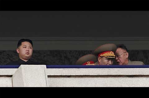 Lãnh đạo Triều Tiên lúc đó là Kim Jong Il (phải) trò chuyện với một vị tướng khi con trai - Kim Jong Un (trái) đang dự lễ duyệt binh mừng 65 năm ngày thành lập đảng Lao động.