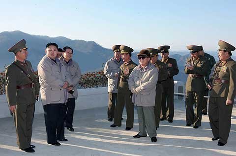 Kim Jong Il (giữa) và Kim Jong Un (thứ 2 từ trái qua) thị sát công trường xây dựng nhà máy điện ở Huichon, tỉnh Jagang.