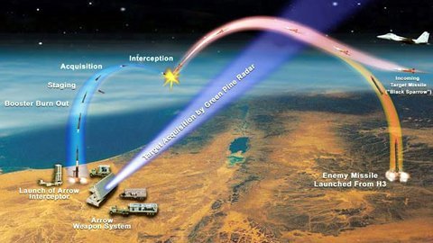 Về cơ bản, hệ thống phòng thủ tên lửa (màu xanh) sẽ có nhiệm vụ đánh chặn các mục tiêu của kẻ thù (màu vàng, màu hồng) khi hệ thống rađa (màu tím) phát hiện ra mục tiêu nguy hiểm