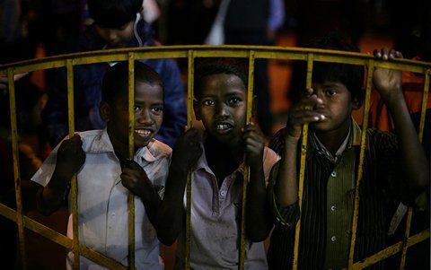 Những cậu bé ở Bodh Gaya, Ấn Độ đang xem lễ hội Kalachakra Buddhist qua phên sắt. (Ảnh: AP)