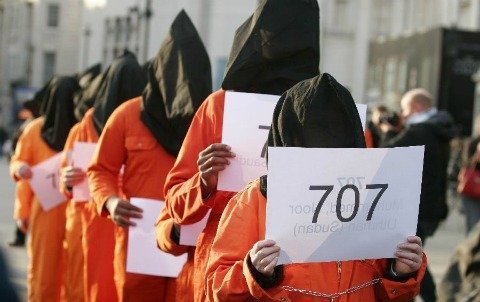 | Người biểu tình ăn mặc giả tù nhân Guantanamo trên quảng trường Trafalgar ở London, Anh hôm 7/1. (Ảnh: THX) |