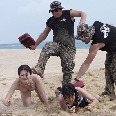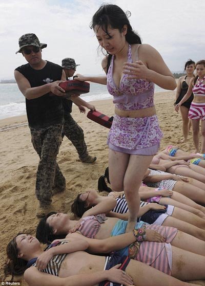 Các cô gái, trong đó có nhiều người là sinh viên vừa tốt nghiệp các trường chuyên nghiệp, bị đá vào người, dìm xuống nước và mang vác vật nặng trong suốt buổi huấn luyện do Công ty vệ sỹ Taijiao tổ chức vào hôm chủ nhật vừa qua.