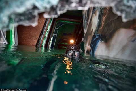hiện nằm nghiêng về một phía, chìm sâu dưới nước 13m.
