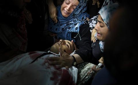 | Thi thể đẫm máu của Mohamed Abu Awda, một trong hai người Palestine bị chết do bom của Israel ở đông bắc Gaza hôm 18/1. (Ảnh: THX) |